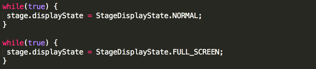 This full window, transparent Flash object as seen above does not trigger the full screen warning that Adobe has implemented as a security feature since the Flash object only occupies the browsing window (even if it is 100% of the page) and not the full page. This is expected behavior since Flash's full screen warning is meant to protect against malicious websites that try to spoof the user's browser UI components.