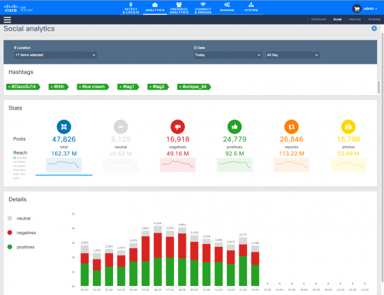 Social Analytics monitors the hash tag Twitter feeds and location of guests and customers to determine sentiment and the need for any specific necessary actions. Venue owners can be alerted of a social media posting that requires an immediate response. For instance, if a hotel guest goes to Twitter to complain about cold water in the shower, the hotel can check the water heater, mitigate the situation, and respond to the guest faster. The rapid response not only helps stop a potential social backlash, it helps also communicate a higher level of customer service and responsiveness.