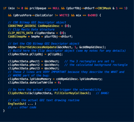 A specially crafted font file can cause the Microsoft Windows CDD Font Parsing Kernel driver to corrupt internal memory structures. The DrvTextOut routine acquires and locks the associated device and behaves differently based on the surface type. If the type is a bitmap and the Windows DWM is on, the driver will read and write directly to the video frame buffer and calls EngTextOut, then exits. However, the driver behaves in an unexpected manner where a new background rect is generated mixing the "OpaqueRect" rectangle located in the sixth parameter and the rectangle located in the "pStringTextObj" object.
