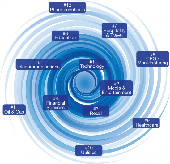 The DBT study ranked the state of digital disruption for 12 different industries. An industry's position relative to the center of the Digital Vortex reflects the state of competition a firm in that industry will face, rather than its own digital capabilities per se. The study ranked Technology, Media & Entertainment, and Retail as the three industries that will see the greatest potential competitive disruption within five years as a result of digital technologies and business models.