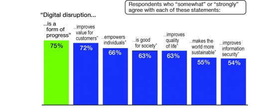 After all, more than any other factors, the Digital Vortex is powered by human ingenuity and a pervasive desire to make life better. Perhaps this is why executives in the DBT Center survey primarily viewed the effects of digital disruption as being positive: 75 percent said digital disruption is a form of progress-that it is moving us in the right direction; nearly as many say the customer ultimately benefits; and two-thirds believe the individual is empowered-not merely as a consumer, but as a human being.