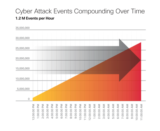 With those numbers, we can plug them in the formula and we get a result of 1.2 million cyber attack events at any given time. By now you are wondering where I am going with this, but here is the key point. Just like time is a compounding factor for the interest rate on a loan, time is also a compounding factor with cyber attack events. Lets assume that our time interval for the above calculation was 1 hour, we can then multiply the result above by 24 hours to get an approximate result of 28.8 million cyber attack events in a 24-hour period.
