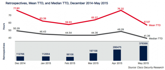 However, the good news is that the median TTD for threat detection by Cisco has been declining. In December 2014, the median TTD-meaning when analysis revealed an unknown file to be a threat-was about two days (50 hours). The current industry standard for time to detection is 100 to 200 days-far too long a time frame, given the fast pace of innovation among today's malware authors. From January to March 2015, the median TTD was between 44 and 46 hours; in April, it edged up slightly to 49 hours. By the end of May, TTD for Cisco had decreased to about 41 hours. The retrospectives chart below-from a case study of Angler-shows the number of files that Cisco initially categorized as "unknown" that were later converted to "known bad."