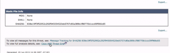 AMP Threat Grid has a clean, easy to use dashboard that empowers Tier 1 analysts, and provides the deep level of content that Tier 3 analysts look for. This may sound obvious, however, sandboxes are actually really great research tools. Unfortunately junior analysts tend not to have the experience to understand sophisticated malware. The integration of AMP Threat Grid with Cisco's email security allows junior analysts to pivot directly from email security to the AMP Threat Grid portal, as shown here: