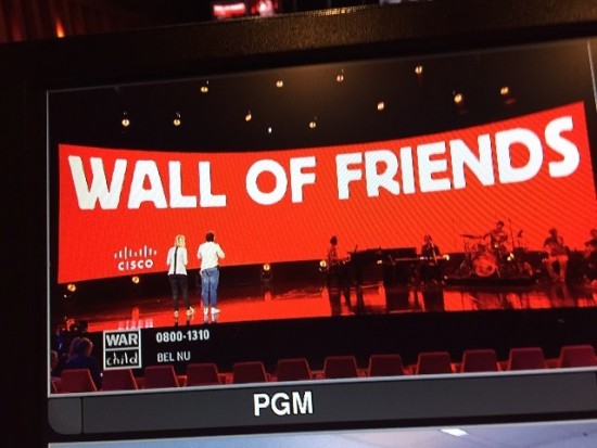 War Child, a Dutch nonprofit that Cisco has supported for ten years with cash and product grants, held a televised event to raise money for its work on June 10. During the show, video reports of children affected by war were shown on a giant 17-by-4-meter "Wall of Friends," based on Cisco collaboration technology. The Wall of Friends uses the same Cisco technology seen on the "Wall of America" on Jimmy Kimmel Live!