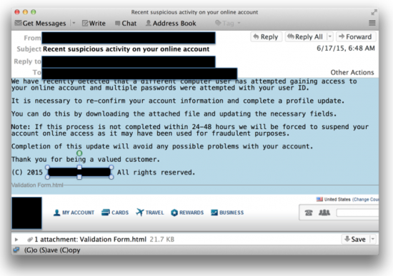 Attackers are constantly looking for ways to monetize their malicious activity. In many instances this involves targeting user data and accounts. Talos continues to see phishing attacks targeting customers of multiple high profile financial institutions. In the past couple of months, we have observed phishing attacks against various financial customers including credit card companies, banks, credit unions, and insurance companies, as well as online businesses such as Paypal and Amazon. These phishing attacks have gone old-school in that they either attach an HTML document or include HTML data in the actual email to present the user with official looking pages that appear to be from the actual businesses being targeted.
