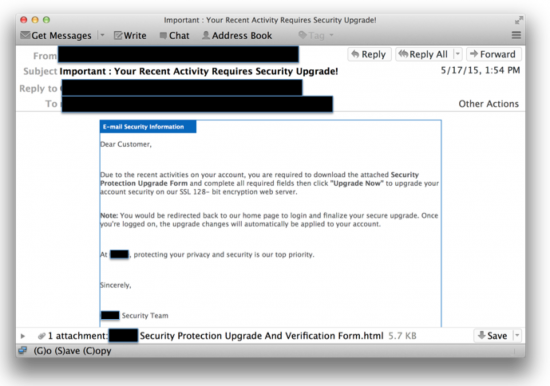 Although many phishing attacks attempt to get the user to open attachments that are designed to load malicious software on the user's system, we have noticed that some attackers have stuck with the basics. Instead of trying to get a user to download or run malicious attachment, these current attackers are simply attaching an HTML document to their phishing emails or including the HTML instructions in the body of the email itself. The following shows the a sample of the realistic phishing attempts that these attackers can generate to trick users into revealing their sensitive information.