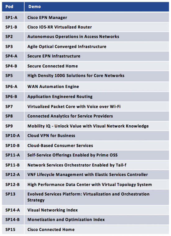 We had over 60 SP-focused breakout sessions that were all well attended. Additionally, we developed 22 SP demonstrations for the World of Solutions, all focused on delivering business outcomes -enhanced agility, lower expenses, and more revenue -for our customers. Here is a list of the demos that we gave. If you would like to see any of these demos, please contact your Cisco Account Representative.