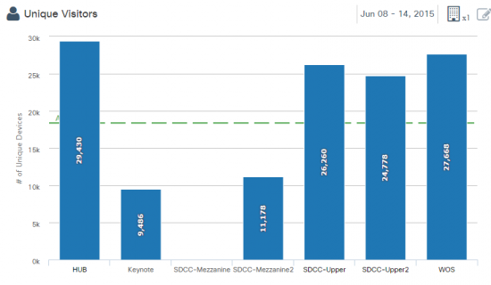 - John Chambers keynote was very popular -the Keynote area (the light blue line) shows a massive spike during the keynote peaking at more than 5000 unique devices