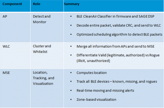 Conclusion: As the premiere WLAN infrastructure equipment provider, Cisco provides the ability for existing APs to detect BLE devices acting as proximity services beacons. This includes monitoring, detection, location, and reporting of so-called "rogue" proximity services beacons (i.e., BLE devices that have been deployed without the permission of the venue owner and possibly for malicious purposes) in addition to asset tracking of legitimate BLE devices (includes alerting of missing/moved BLE devices).
