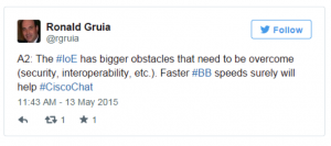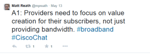 This is just a sampling of the questions, conversation, solutions and insights shared during this particular #CiscoChat. Take a look at the recap and use hashtag #CiscoChat on Twitter to share your own answers to the questions we posed (including what would you do with a Gig in your house). Be sure to bookmark our calendar and join our next discussion using hashtag #CiscoChat.