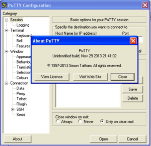 The primary mode of infection relies on users to search for PuTTY and follow a link to a fake mirror rather than the legitimate PuTTY page. To increase the chances users reach the malicious mirrors, the attackers have used search engine optimization techniques. Some HTML pages hosted on the compromised servers reference PuTTY for Mac, PuTTY for Android platforms, or even more obscure things like PuTTY and shampoo, for example. The malicious PUTTY.exe (MD5 b5c88d5af37afd13f89957150f9311ca) comes in the PE format, just like the original. This trojanized version of PuTTY maintains a user interface and function seemingly similar to the original. One difference is the binary was compiled with a different version of Microsoft Visual C++ than PuTTY traditionally has been, and results in a slightly altered user interface. Also, the "About" button reveals altered information, being listed as "Unidentified build, Nov 29 2013 21:41:02." Given that presumable compile time, that is only a couple of months after the release of PuTTY v0.63, which labels itself as "Release 0.63" under "About."