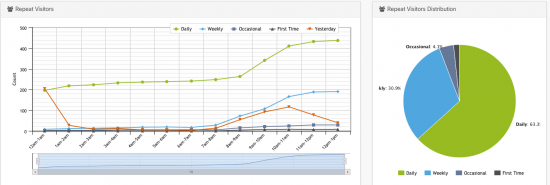- Repeat Visitors reveals the percentage of visitors who frequent the business (loyal customers) vs. new visitors (first time)