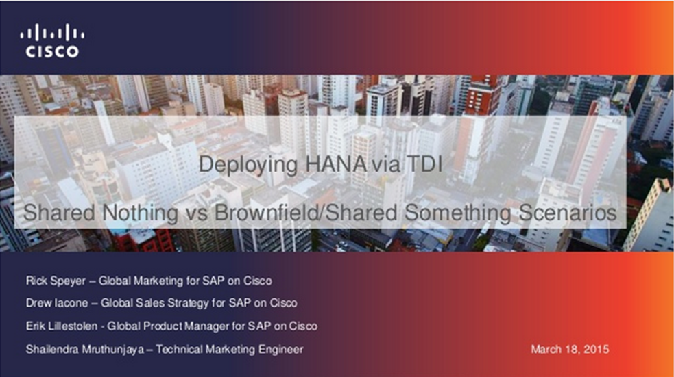 Cisco and its partners deliver a TDI deployment model using a common architectural approach, built on standard building blocks with the Cisco Unified Computing SystemTM (Cisco UCS?) as the base. This approach gives application datacenter managers flexibility of choice in the way that they implement SAP HANA. Cisco supports the SAP HANA TDI deployment with shared storage and shared networking today.