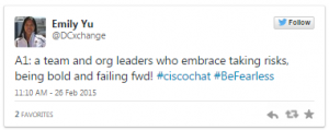 Following the Women in Impact Conference, the team hosted a second "Be Fearless" #CiscoChat to discuss highlights from the conference and how women can remain fearless while pursuing career passions. Chat participants shared their real-life solutions, from paying closer attention to personal health to the reliable practice of just trusting their instincts. See the full #CiscoChat recap on Storify.
