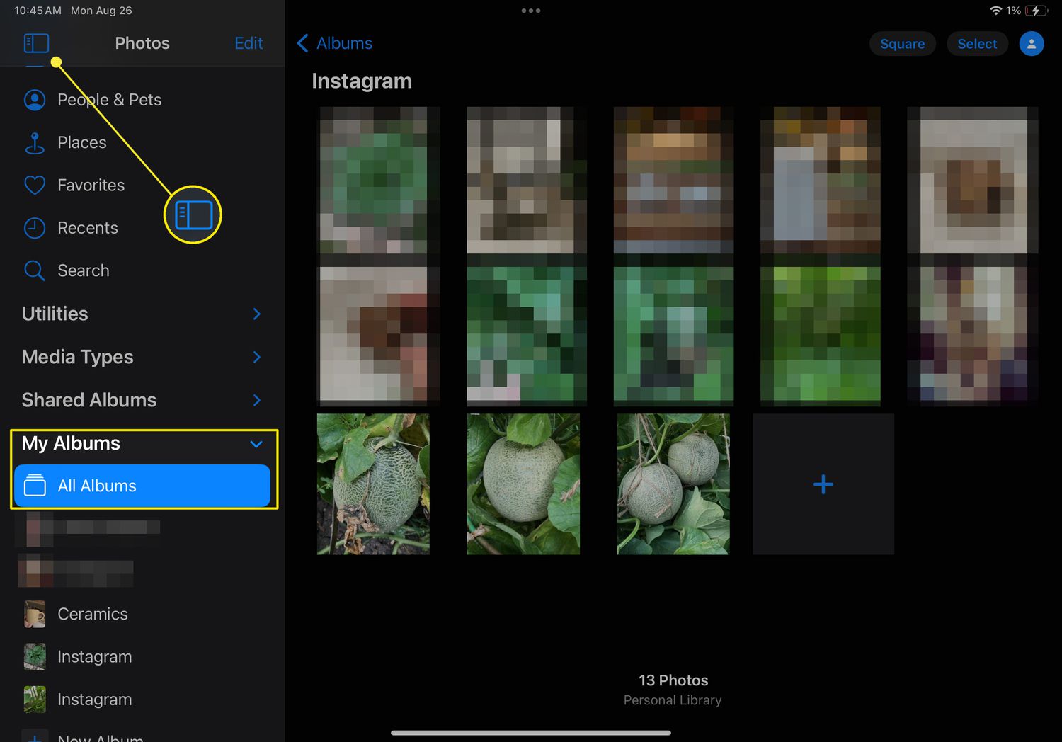 Swipe from the left or tap the Sidebar icon to view all albums under My Albums. Select a specific album to locate the pictures you want to add to a new album.