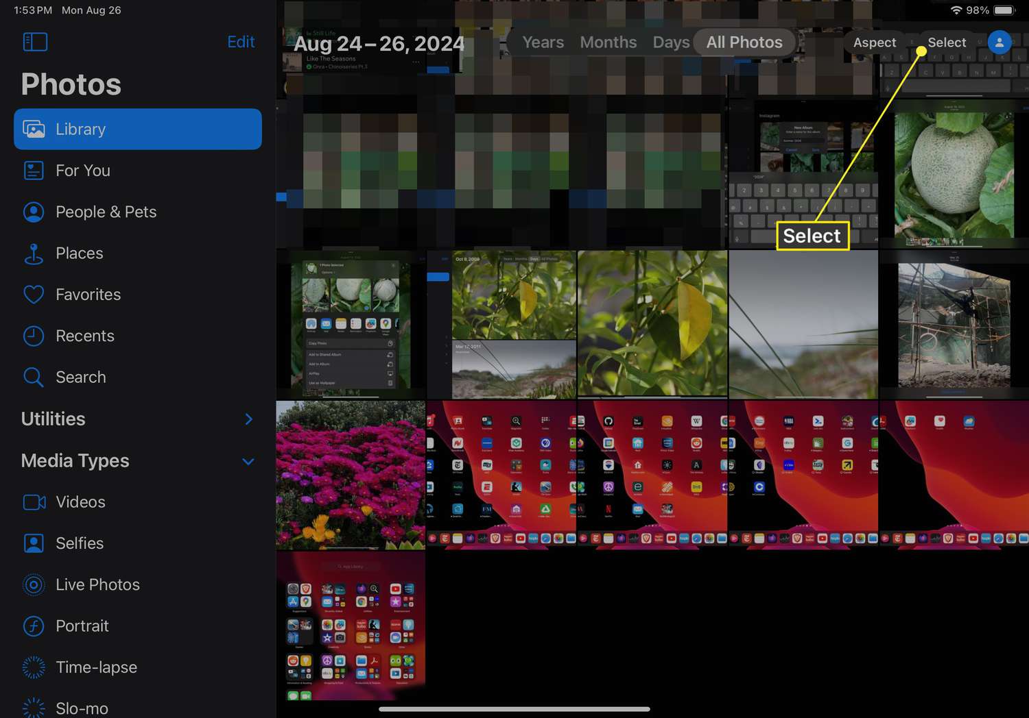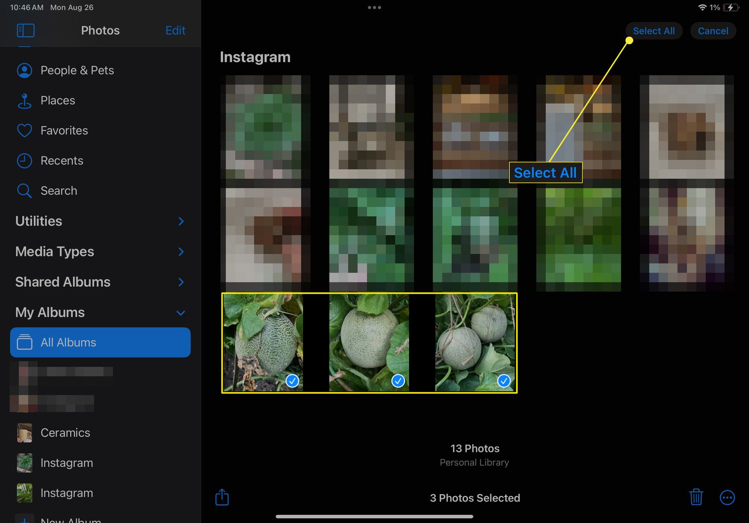 Tap Select from the upper-right corner and tap once on each image you want to include in the custom album. Or, choose Select All.