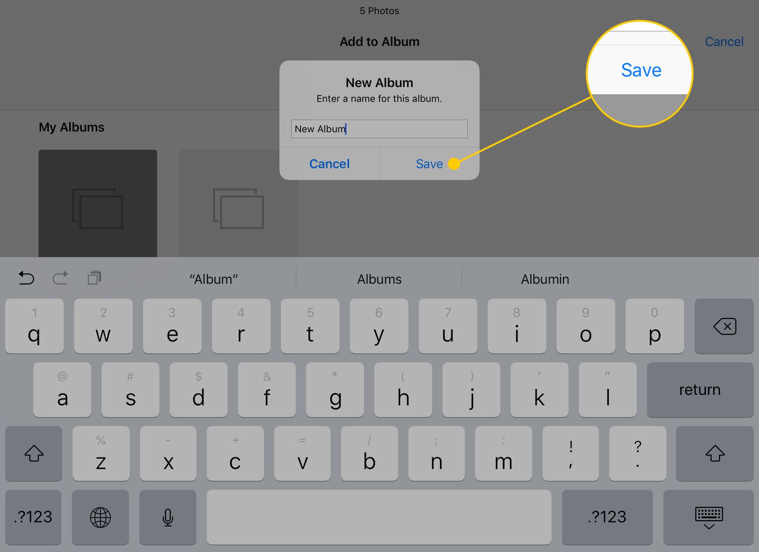 If you create a new album, type a name for it in the window that pops up, and then tap Save.
