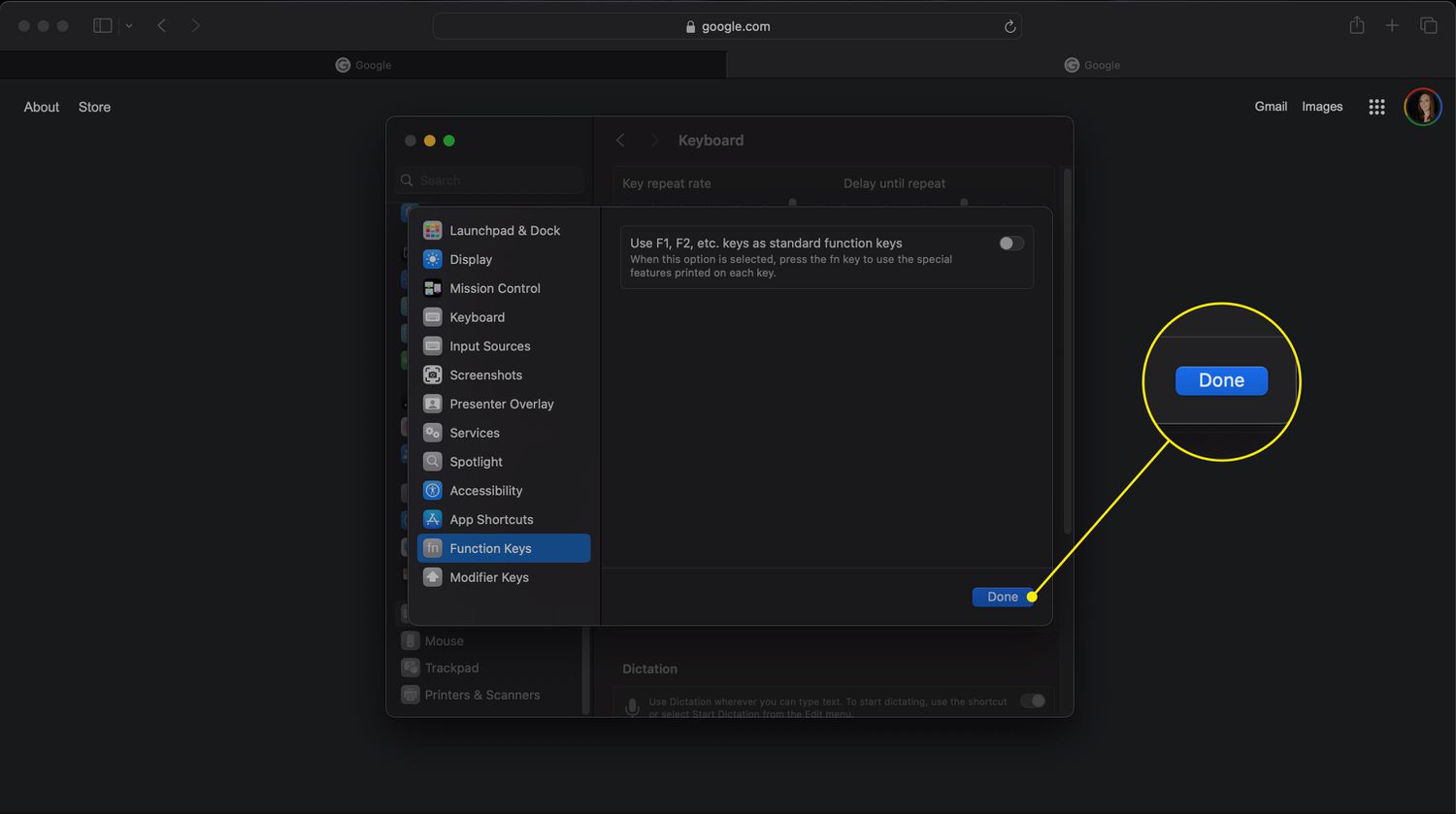 From here, toggle Use F1, F2, etc. keys as standard function keys on, then click Done.