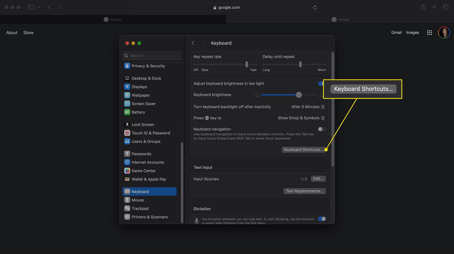 From there, click Keyboard, and then click Keyboard Shortcuts.