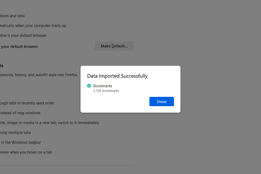 Wait while bookmarks and other items are imported. Click Done to start using the bookmarks in Firefox.