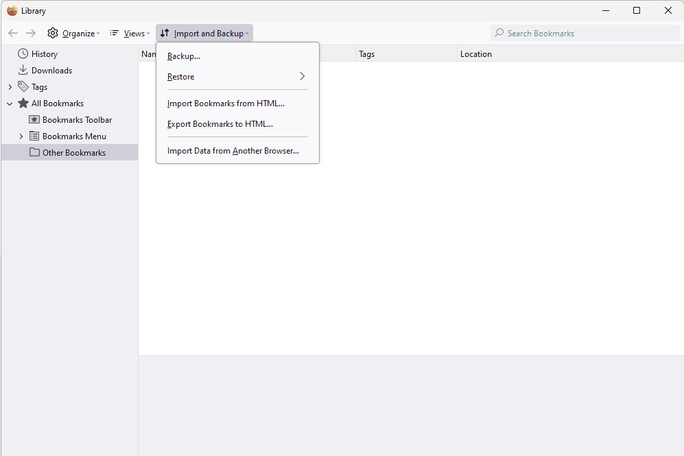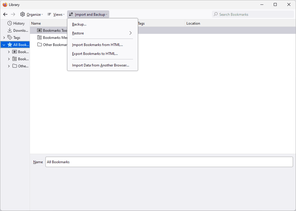 Select Backup to create a JSON file, or Export Bookmarks to HTML to make an HTML file. Both can be re-imported into Firefox later; pick HTML unless you have a specific reason for the bookmarks to exist in the other format.