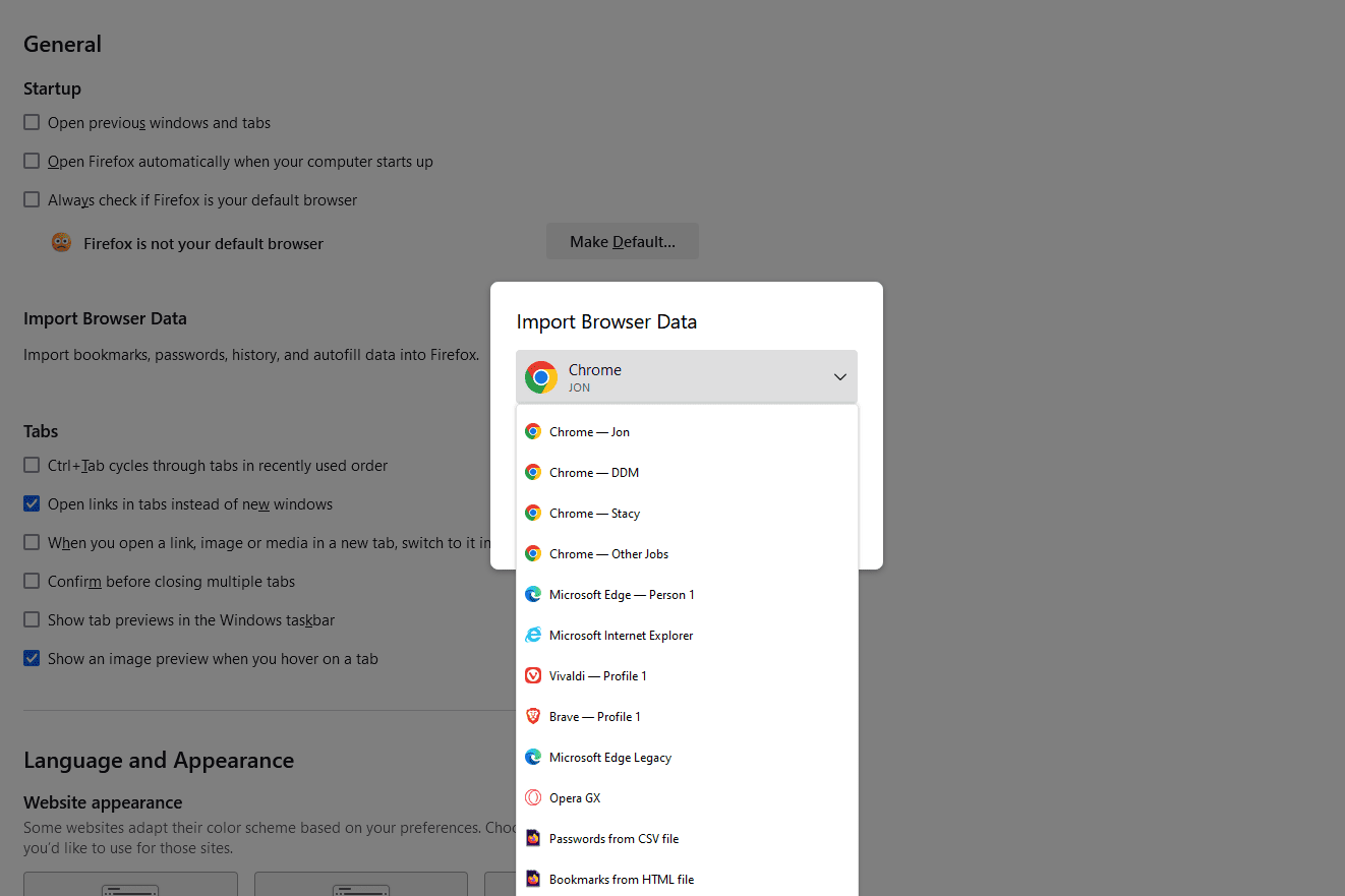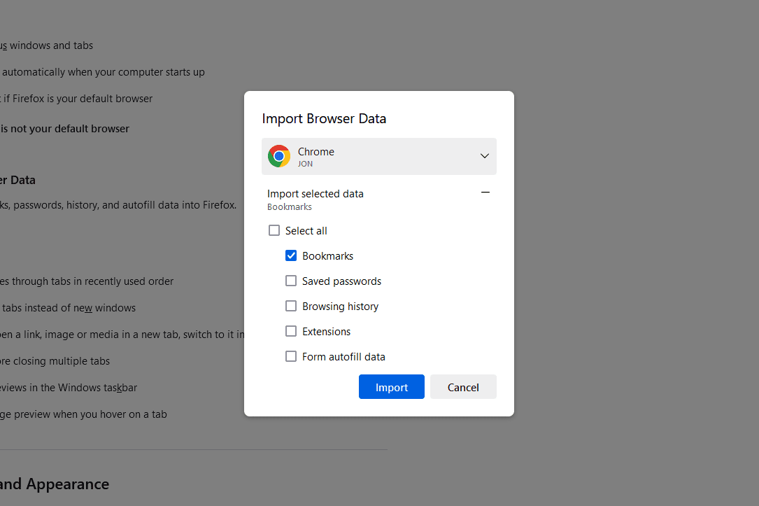 Select Import all available data and then choose what to add to Firefox. Depending on the browser, options might include extensions, autofill data, passwords, and browsing history. Select Bookmarks or Favorites to import those only.