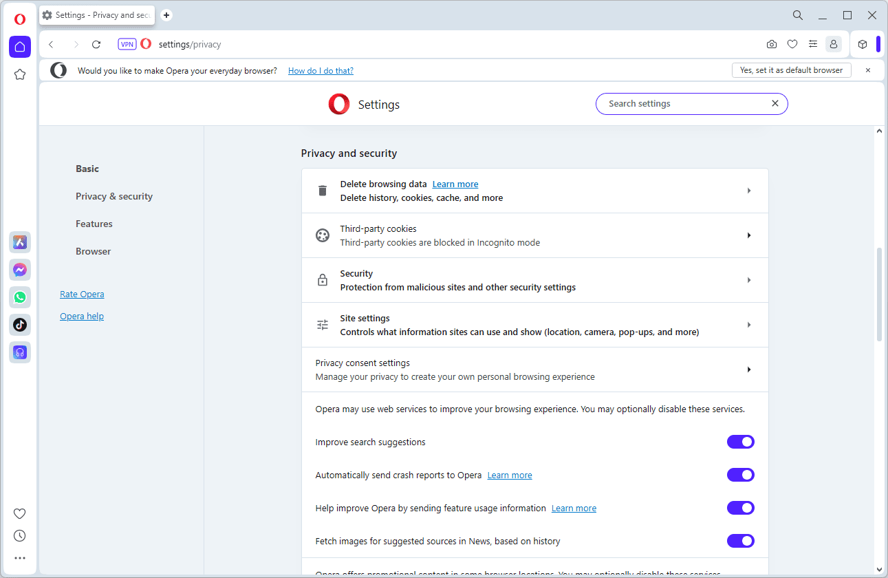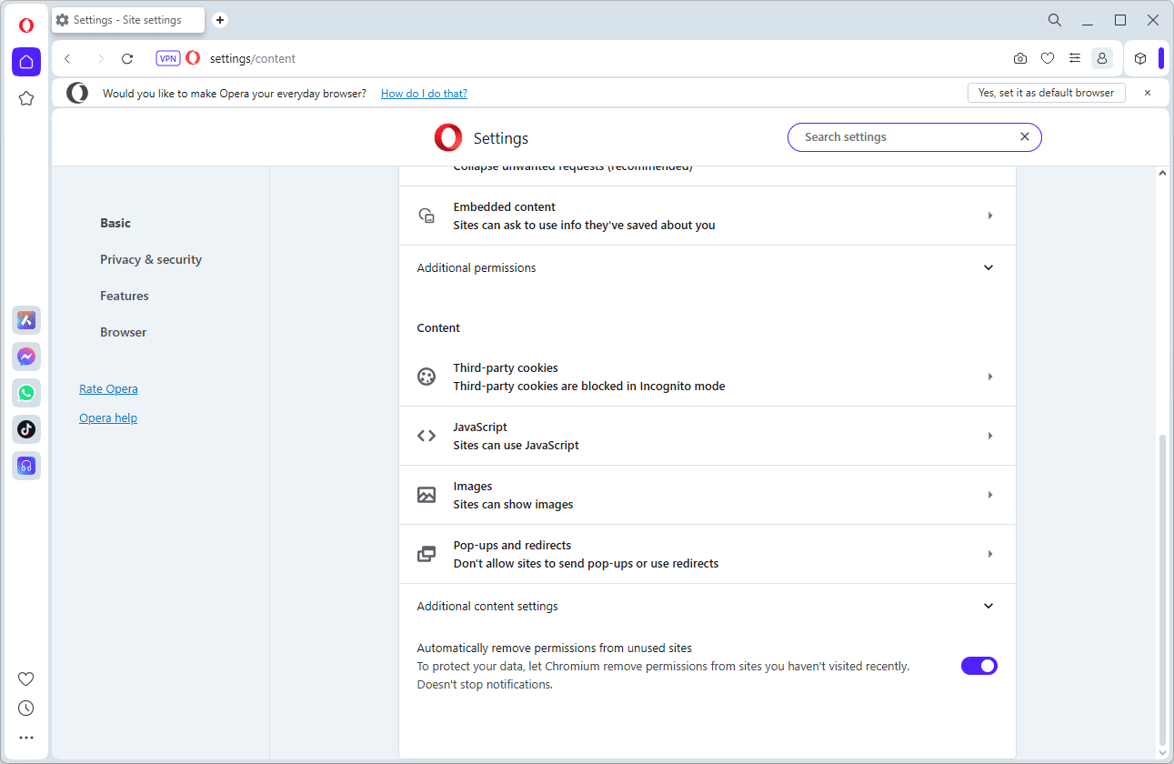 Opera has two settings related to JavaScript. Follow these steps to disable JavaScript across all sites or pick specific websites that aren't allowed to use it.