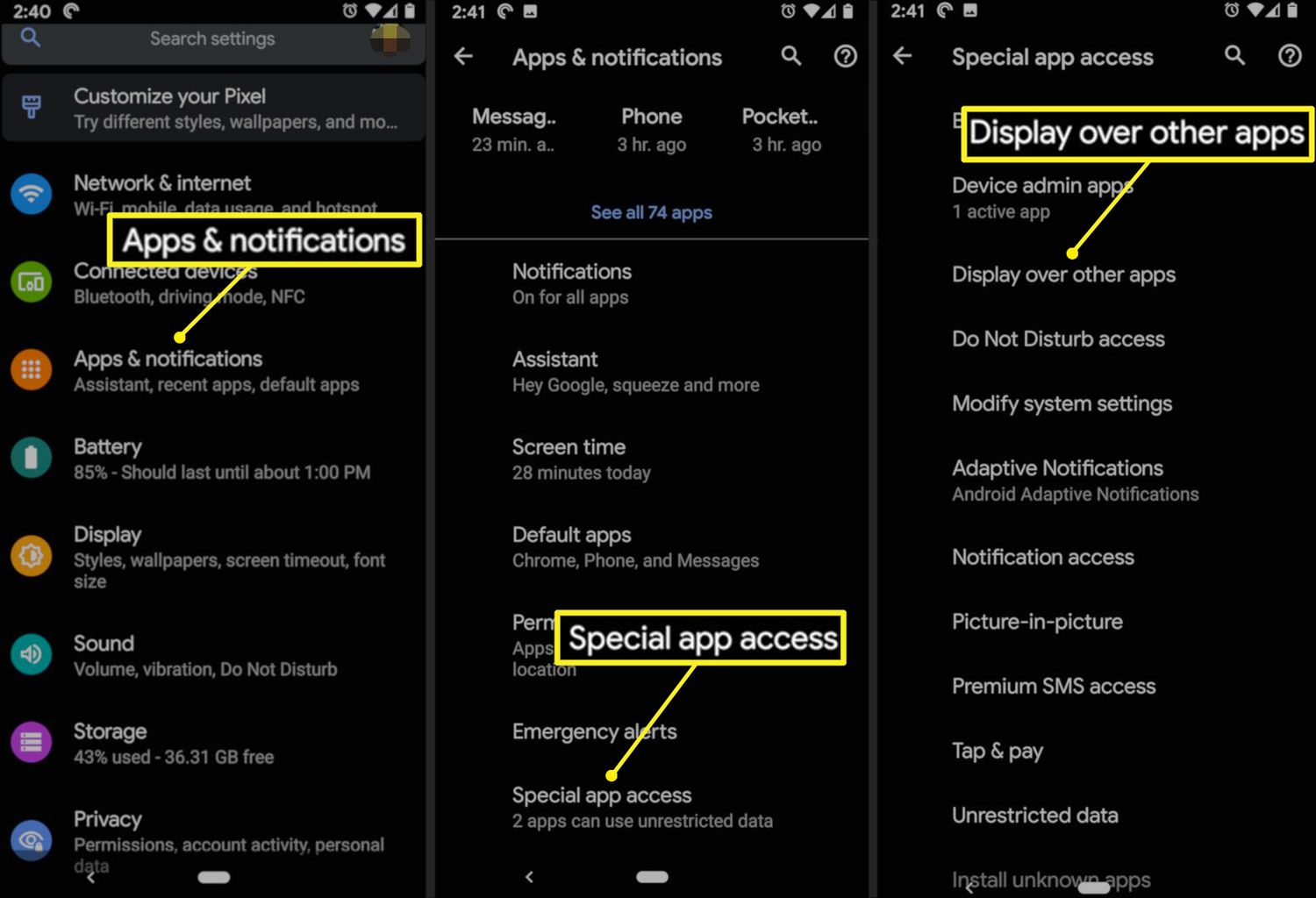 - Go to Settings > Apps & Notifications. In Advanced options, select Special app access > Display over other apps.
