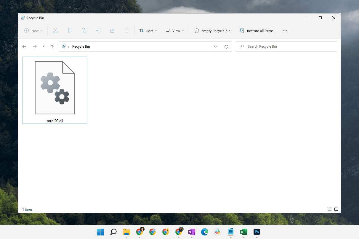 Restore the file from the Recycle Bin. The easiest possible cause of a "missing" mfc100.dll file is that you've mistakenly deleted it. If you suspect this, but you've already emptied the Recycle Bin, you may be able to recover it with a free file recovery tool.