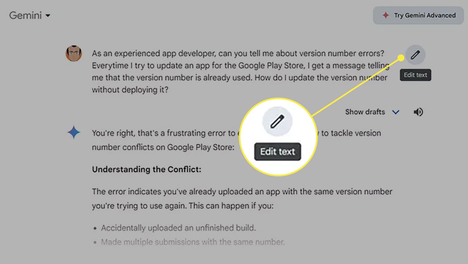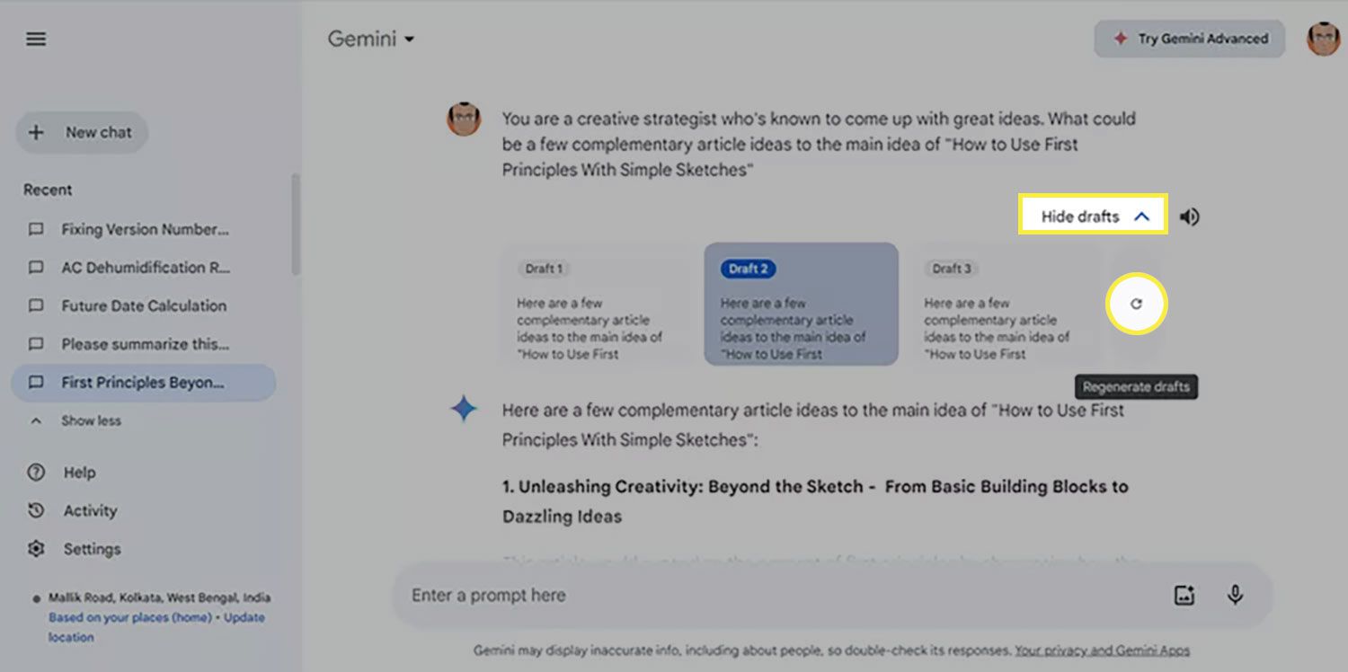 1. Select Show drafts and view two more versions of the result. You can choose Regenerate drafts to force Gemini to make another attempt at better answers.
