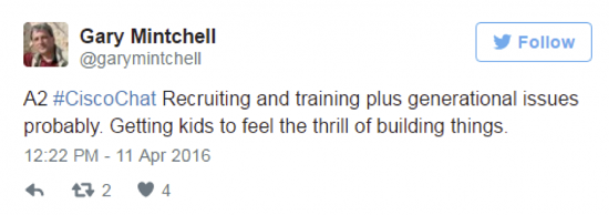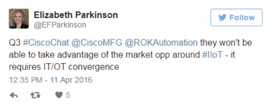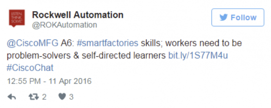 To address these challenges, I hosted a #CiscoChat this week with Paul Taylor, Strategic Alliance Manager at Cisco, Dan McGrath, Senior Business Development Manager at Panduit, and Jeff Gao, Corporate Director at Cisco. We discussed workforce challenges such as the IT/OT knowledge gap as well as how to attract and prepare workers for the changing industry landscape.