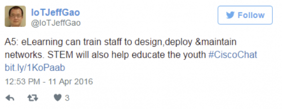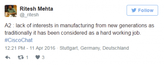 If you didn't have a chance to attend the #CiscoChat, you can get a full recap of the questions and responses by reading our Storify. We will have more discussions in the future, so be sure to follow the @CiscoMFG team and keep up with the conversation using the hashtag #CiscoChat.