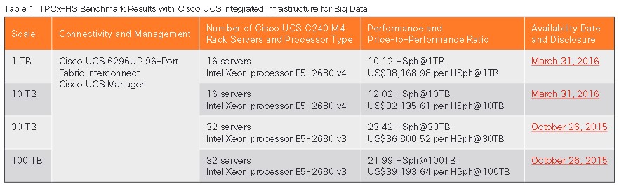 Cisco continues to demonstrate its commitment to industry-standard benchmarks by being the first vendor to publish TPC Express Benchmark-HS (TPCx-HS) results using the new Intel® Xeon® processor E5-2600 v4 family