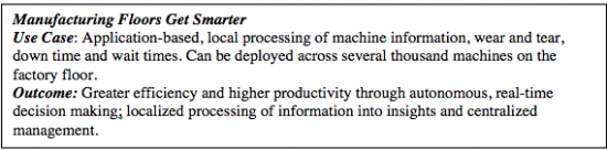 It is, therefore, more optimal to employ a combination of cloud computing and edge computing to industrial IoT solutions. The application logic residing in the data center or cloud could focus on long-term data processing, central aggregation and historical analysis of data. The application logic residing in the edge, closer to the IoT devices, could then focus on performing analytics at the edge itself, making real-time decisions and optimizing the bandwidth by intelligently reducing the data before it is sent to cloud. The compute capability that is inherent in the edge network devices can itself be used for performing this edge processing and analytics.
