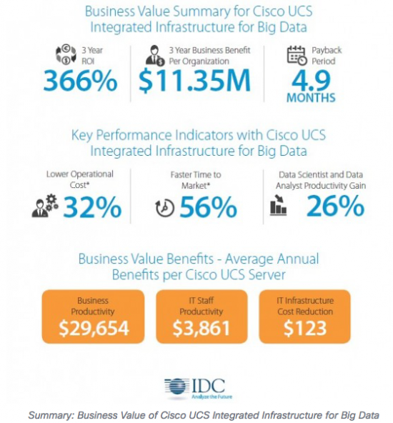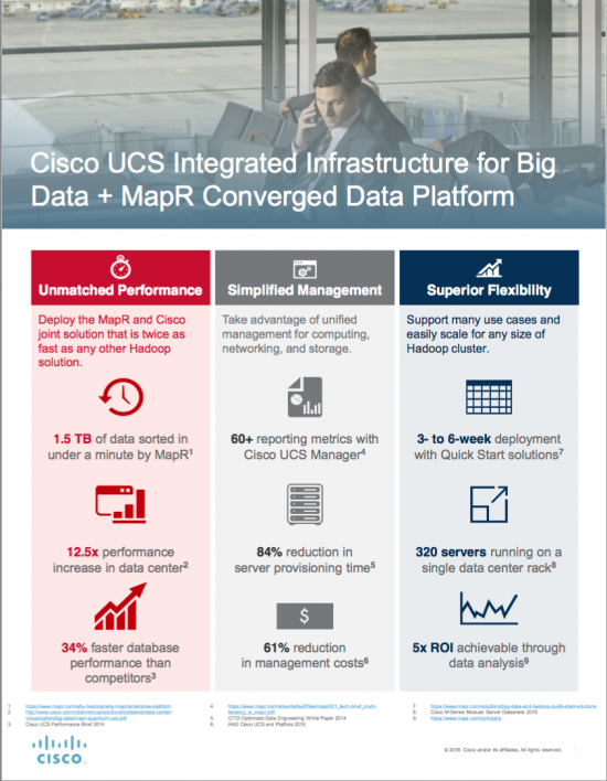 MapR and Cisco deliver unmatched performance, simplified management, and superior flexibility for big data. Gartner has named MapR a Visionary in the Gartner 2016 Magic Quadrant for Data Warehouse and Data Management Solutions for Analytics. IDC also validated that Cisco UCS Integrated Infrastructure for Big Data provides the competitive edge that the customers are looking for (see below).