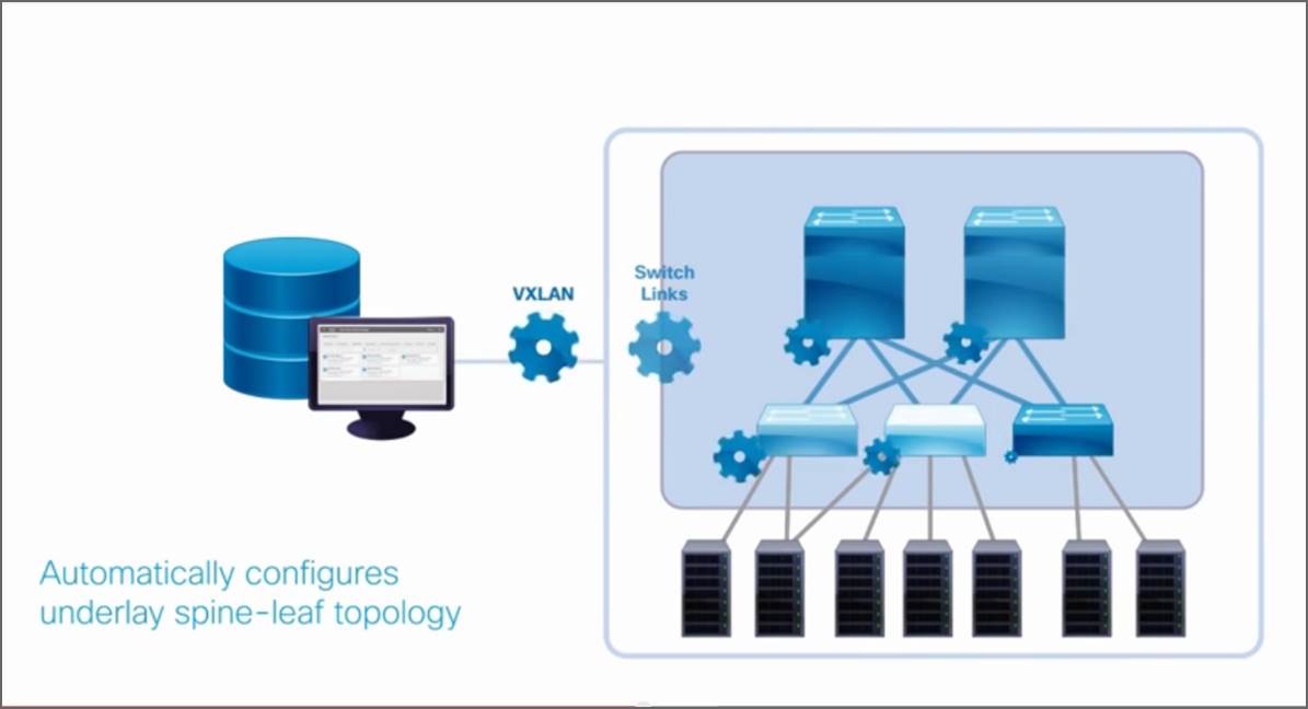 The complete underlay and overlay configuration and management are automated. Using simple requests, like "add switch" or "set up a broadcast domain", and in just a few mouse clicks, the Nexus Fabric Manager self-builds a complete data center spine-leaf underlay and VXLAN overlay, creates broadcast domains, and maps hosts to the domains. With traditional configuration approaches, what would normally take hundreds of CLI configuration commands, Nexus Fabric Manager creates with just a few mouse clicks.