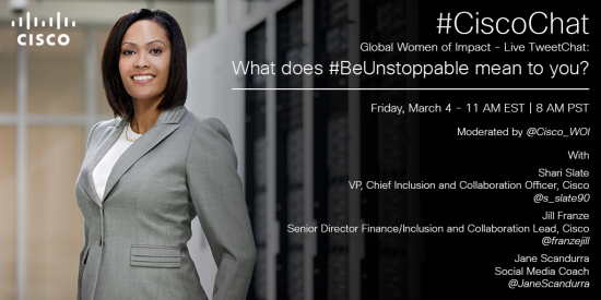 We are having a #CiscoChat on Friday, March 4 from 8-9am PST with VP, Chief Inclusion and Collaboration Officer, Shari Slate, Senior Director Finance/ Inclusion and Collaboration Lead, Jill Franze and Social Media Coach, Jane Scandurra to chat about what it means to #BeUnstoppable. Join us!