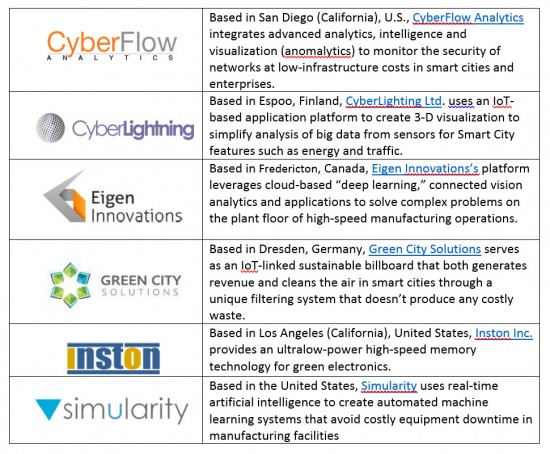 The Super Six represent a broad cross section of geographies, vertical markets and IoT-based solutions. They are based in Canada, Finland, Germany and the United States. Their solutions address some of society's and industry's most serious challenges, including cyber security, energy resources, manufacturing efficiency, equipment maintenance, air pollution and environmental sustainability.