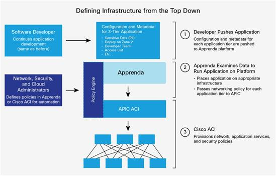 Chris explained that developers are responsible for hosting or making changes to their applications on Apprenda. They need not be aware of the underlying network or infrastructure architecture, which is abstracted by the Apprenda platform, to do their jobs - the platform takes care of those details. When the developer is ready to host the application on the platform, the developer defines information about the application, such as whether it includes personally identifiable information (PII). This definition creates policy information about the application. The Apprenda platform passes that policy information from the application configuration file and metadata to Cisco ACI.