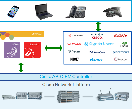 Russell shared that Nectar provides monitoring capabilities with its Unified Communications Management Platform (UCMP) solution, which help identify where communication problems are occurring. In addition, the recently launched Nectar Evolution provides the means to set the appropriate QoS settings to correct the problem. Nectar Evolution learns about UC events in real time and communicates them to the APIC-EM controller from Cisco using corresponding APIs. This intelligence, when given to the APIC-EM, enables it to configure the network dynamically with the right prioritization and capacity needed for the two endpoints to communicate effectively.