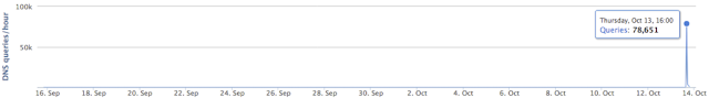 The images below, taken from Umbrella Investigate, nicely illustrate the difference between a typical snowshoe spam campaign versus a typical hailstorm spam campaign. The top image below illustrates what the DNS query volume looks like for a domain involved in a typical snowshoe attack. Note the maximum query rate is only 35 queries per hour for the snowshoe domain example. The bottom graph, in contrast, shows the DNS query volume for a domain involved in a typical hailstorm attack. In this graph, there is practically no query volume until suddenly when the DNS query volume spikes to over 75K queries per hour, then drops back down to nothing.