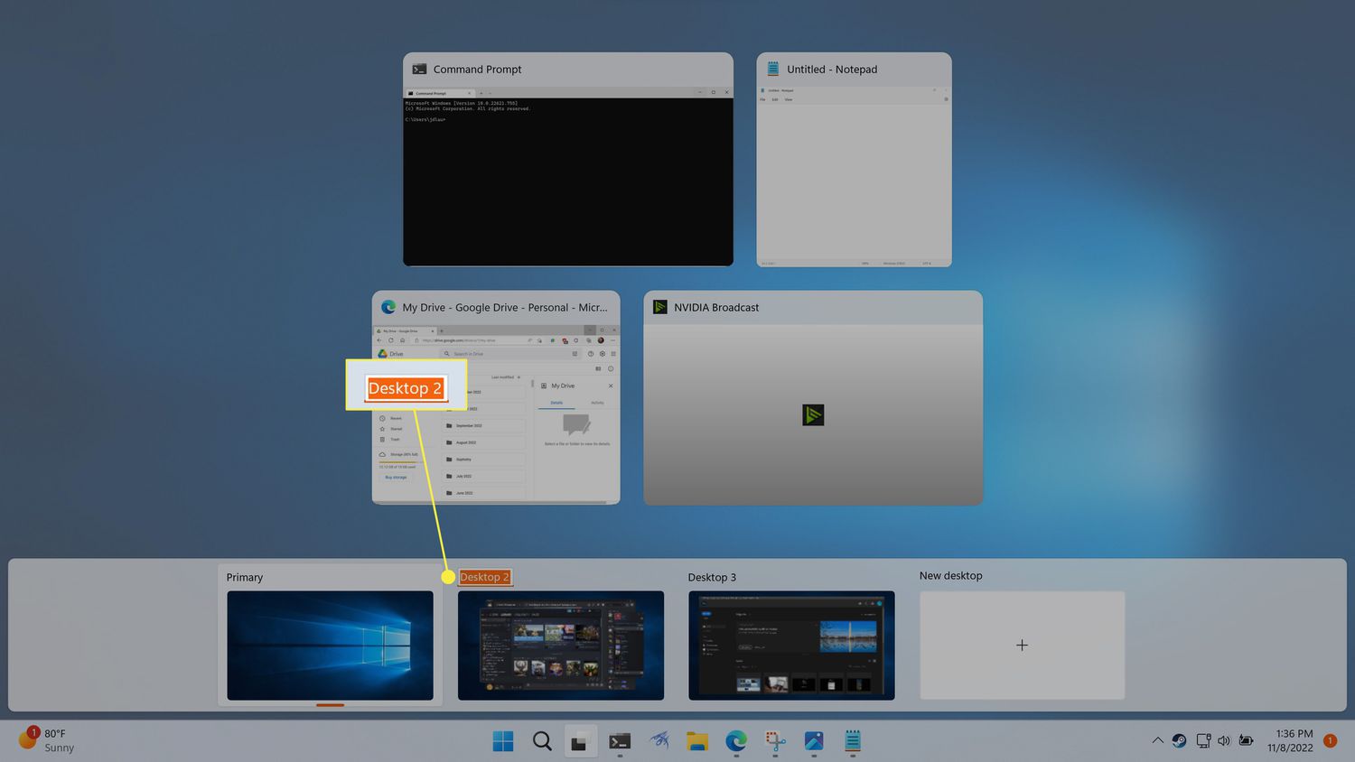 There are three ways to switch desktops in Windows 11. You can use the full Task view window, the Task view popup, or a keyboard shortcut.