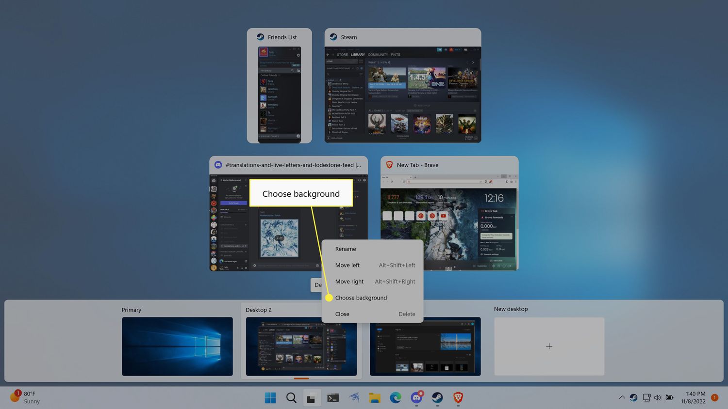 Here's how to change the wallpaper on a Windows 11 virtual desktop: