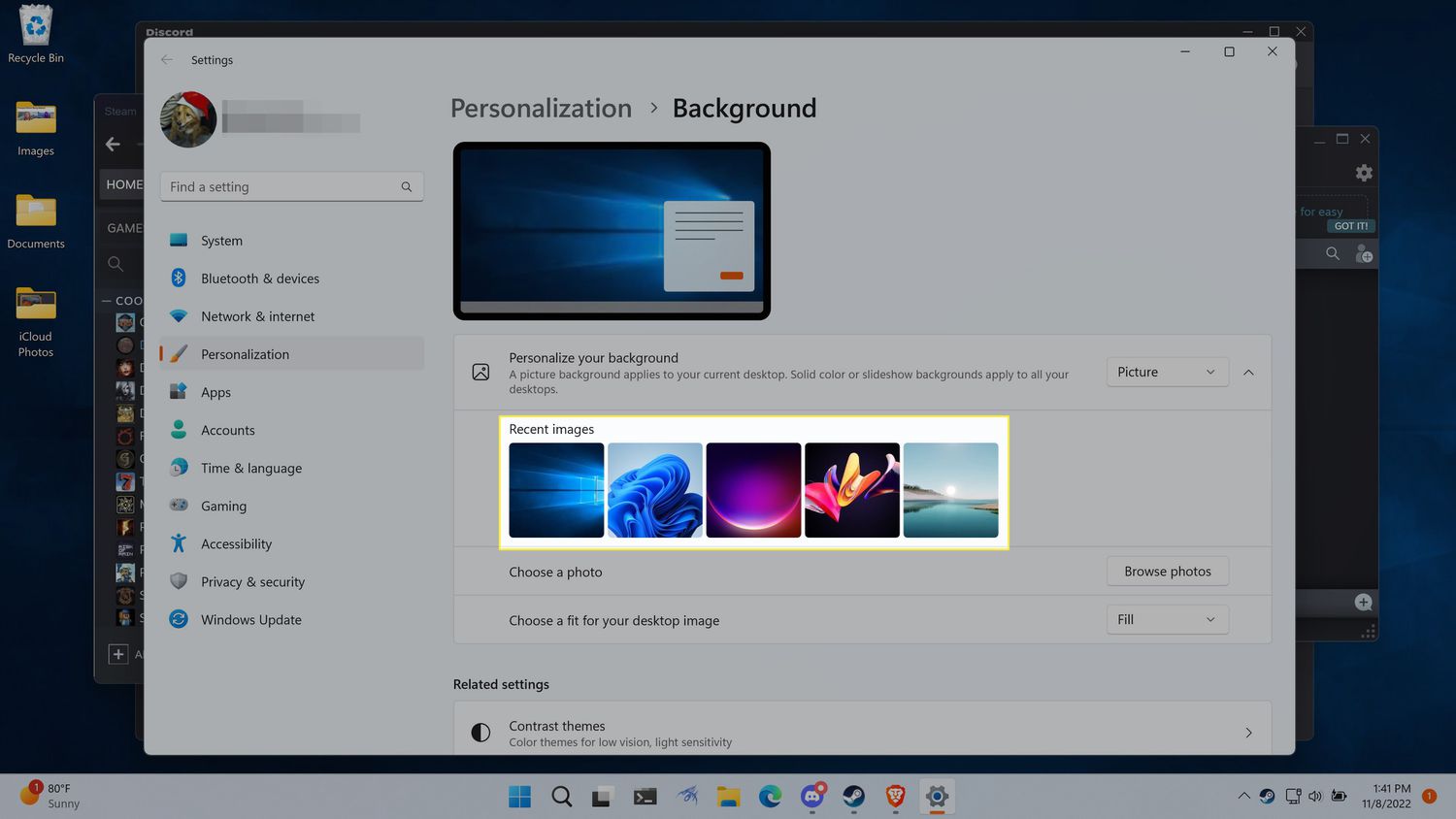 Click one of the background images in the Recent images section.