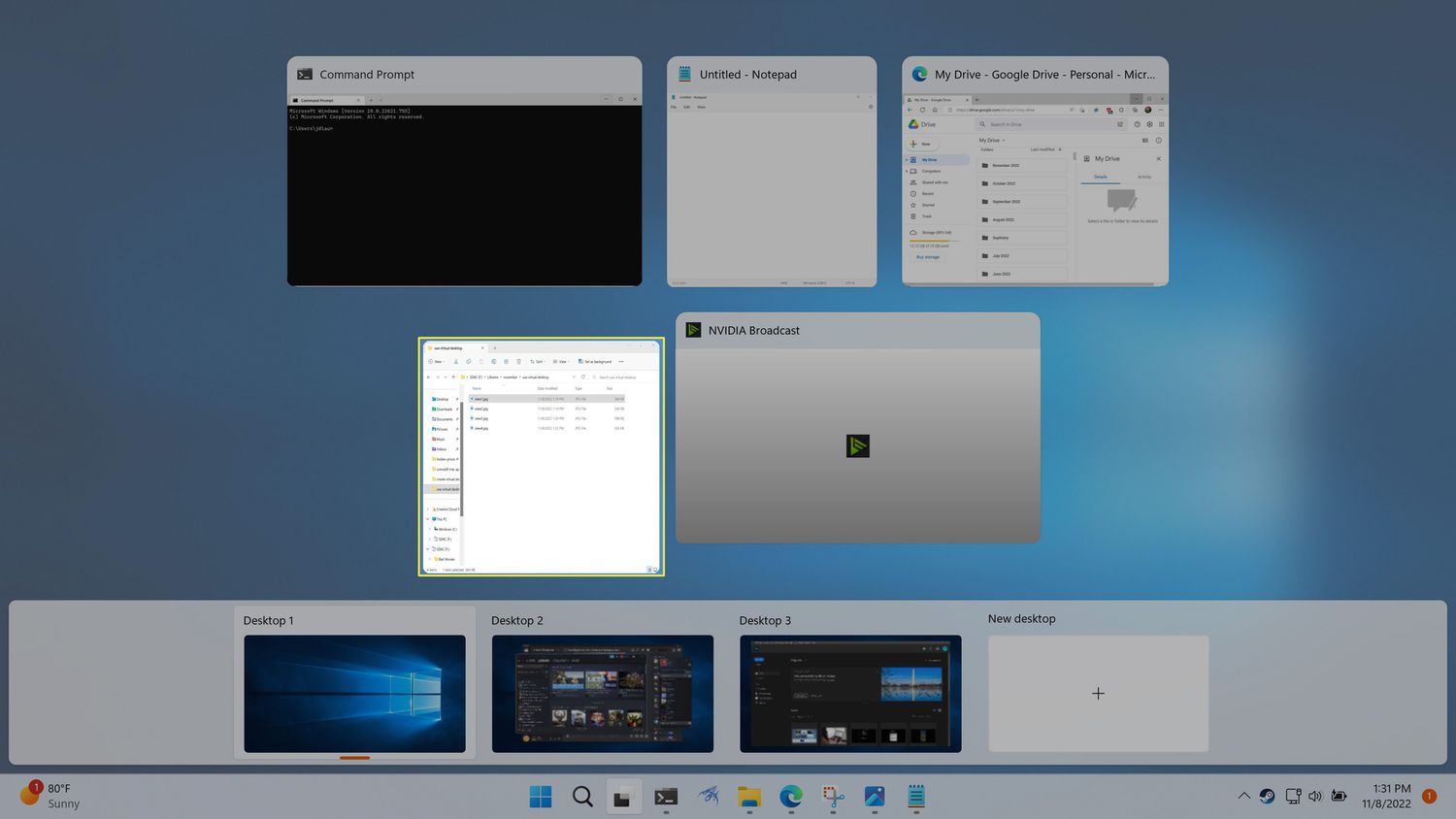 Task view shows your desktops on the bottom row, with the apps from the active desktop displayed above.