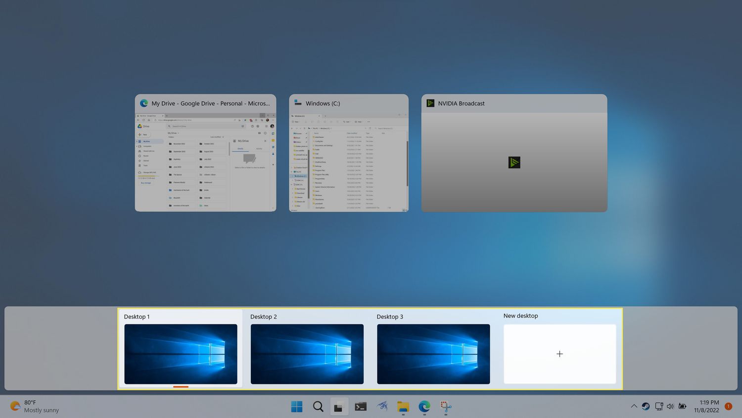 There are two ways to check out an overview of your current virtual desktops. You can either open Task view for a full overview of your desktops and the active apps on your current desktop or check a quick view of just your active desktops.