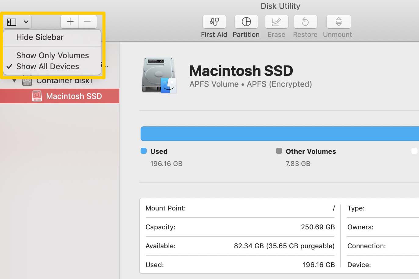 Below the View menu button are the drives attached to your machine. Select your primary drive; it contains Macintosh HD within it.
