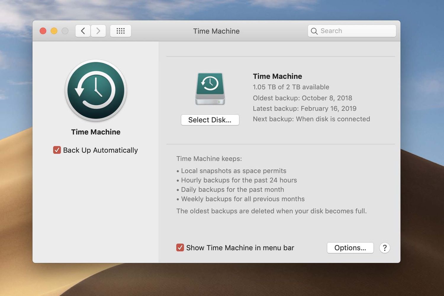 Within a few minutes, the backup process begins. Your first backup may take a few hours or more depending on how much data is on your machine. Check back in the Time Machine preference pane to confirm when Time Machine has finished its first backup. It will note when its latest backup completed. For more information, check out our detailed tutorial on using Time Machine.