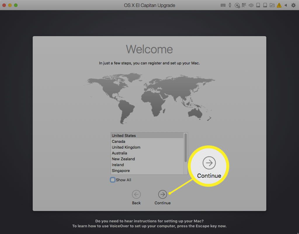 When the Welcome screen appears, select which country your Mac will be used in. Choose Continue.